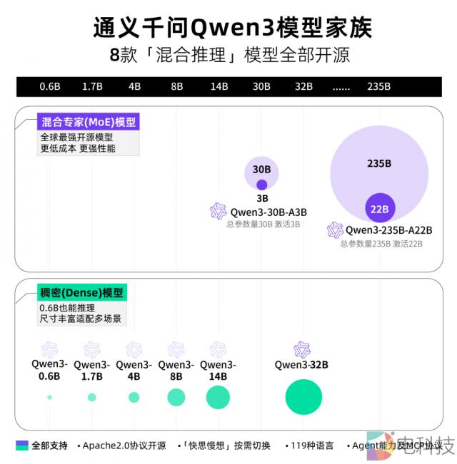 4 月 29 阿里巴巴每天都会发布 Qwen 3 系列模型,这是 Qwen 最新的大型语言模型系列成员。此次发布的模型阵容丰富,包括:2 一位稀疏混合专家(MoE)模型:Qwen3-235B-A22B 和 Qwen3-30B-A3B1, 6 参数规模包括一个密集模型。 32B 至 0.6B,均采用 Apache 许可证。