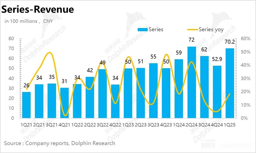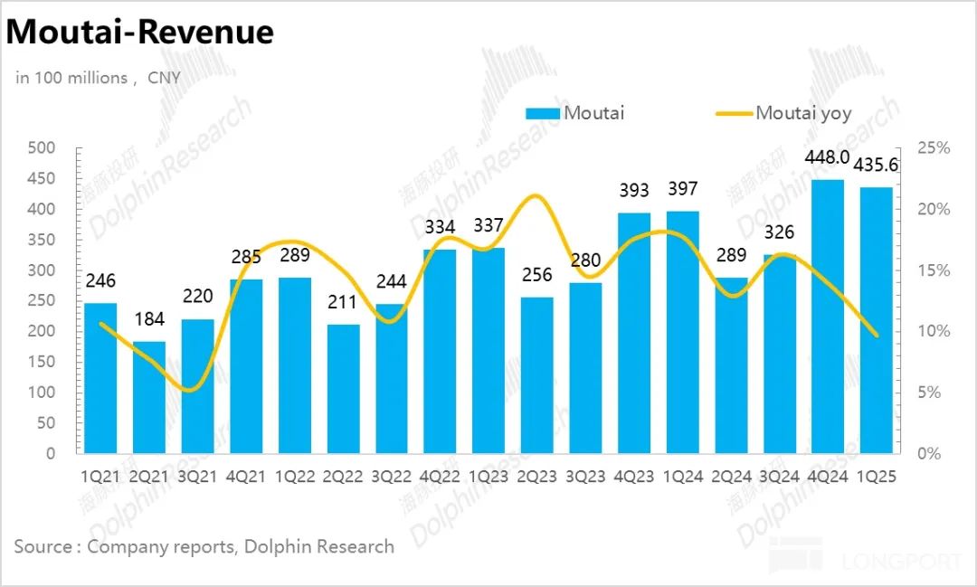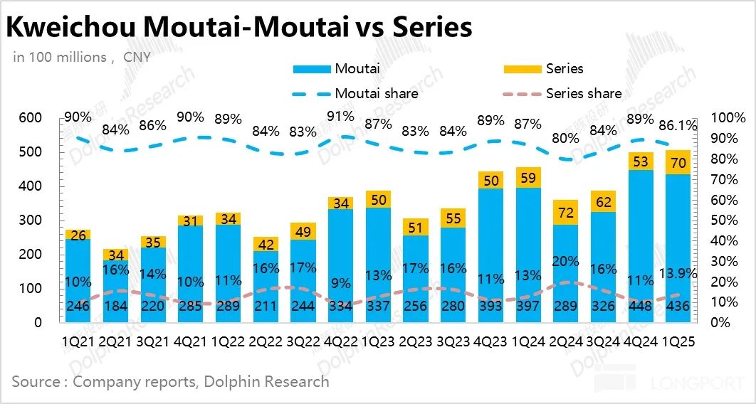 2、茅台酒:控货挺价:1Q25 茅台实现收入 435.6 亿元,同比增长 9.7%。虽然茅台在季报中没有披露销量,但考虑到天妃控制的商品价格相当高,海豚君推断茅台的增长更多来自于非标准葡萄酒投放增加带来的价格贡献。