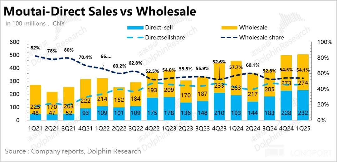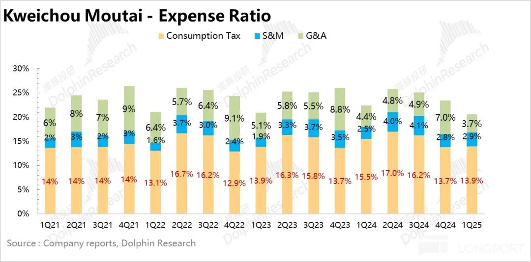 4、直销比例略有增加:就渠道结构而言,1Q25 茅台直销渠道销售比例为 与之相比,45.9% Q3 略有改善,整体仍保持高位。为了减少海豚君的推断 500ml 天妃经销商的库存压力,茅台延续了 Q4 策略不断增加非标产品(如生肖酒、100毫升) 小礼盒等)的投放力度。(通常通过直接渠道投放非标产品)。从中长期来看,茅台直营渠道比例的增加仍然是必然趋势。在行业下行期间,它不仅可以更好地稳定价格体系,还可以增加自己的利润。无非是短期节奏需要平衡经销商的利益。