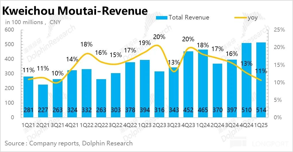1Q25 茅台共同实现收入 514.4 亿元,同比增长 10.7%,略超市场预期一致(市场预测为 507 亿元)。全年小幅超过一年 9% 增长目标,但是从往年茅台分季度的盈利节奏来看,由于第一季度包含了传统的春节白酒旺季,所以增长率一般是最高的,一季度增长 10% 表明 2025 年度业绩放缓到双位数以内已经成为大概率事件。