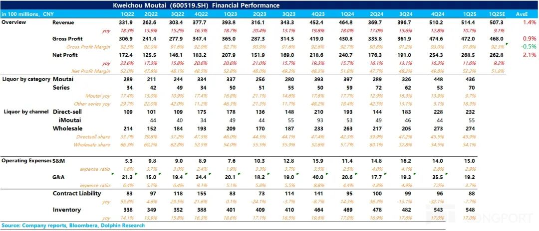 1、业绩如期减速:1Q25 茅台共同实现收入 514.4 亿元,同比增长 10.7%,略超市场预期一致(市场预测为 507 亿元)。全年小幅超过一年 9% 增长目标,但是从往年茅台分季度的盈利节奏来看,由于第一季度包含了传统的春节白酒旺季,所以增长率一般是最高的,一季度增长 10% 表明 2025 年度业绩放缓到高单位数已经成为一个大概率事件。