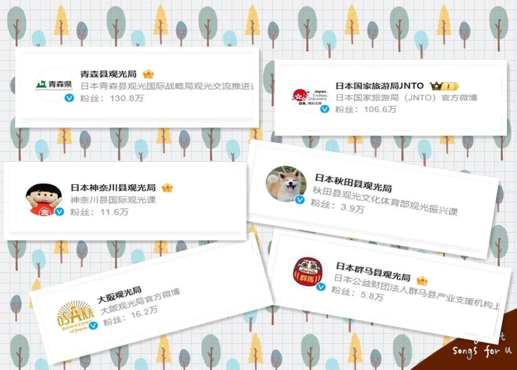 由于 @青森县观光局 官方微博账号坐拥 130万 粉丝 ,不但碾压了日本城市观光局的微博官方账号,如@日本群马县观光局(5.8万粉丝)、@日本神奈川县旅游局(116,000粉丝)、@观光局(39,000粉丝)日本秋天县、 @大阪旅游局(16.2万粉丝) ,就连 @JNTO(106.6万粉丝)日本国家旅游局 也望尘莫及。