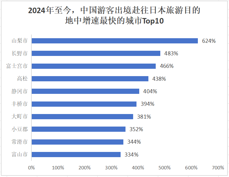 携程数据显示,自2024年以来,中国游客前往日本旅游目的地中增长最快的城市Top10都是小城市(如下图所示)。