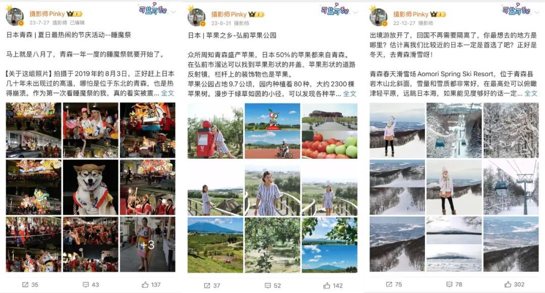 @青森县观光局 还与大量中国KOL合作到青森探访和创作。150 在过去的五年里,粉丝@摄像师Pinky多次前往日本青森,创作了大量相关内容,让中国年轻人发现了一批青森小众景点。