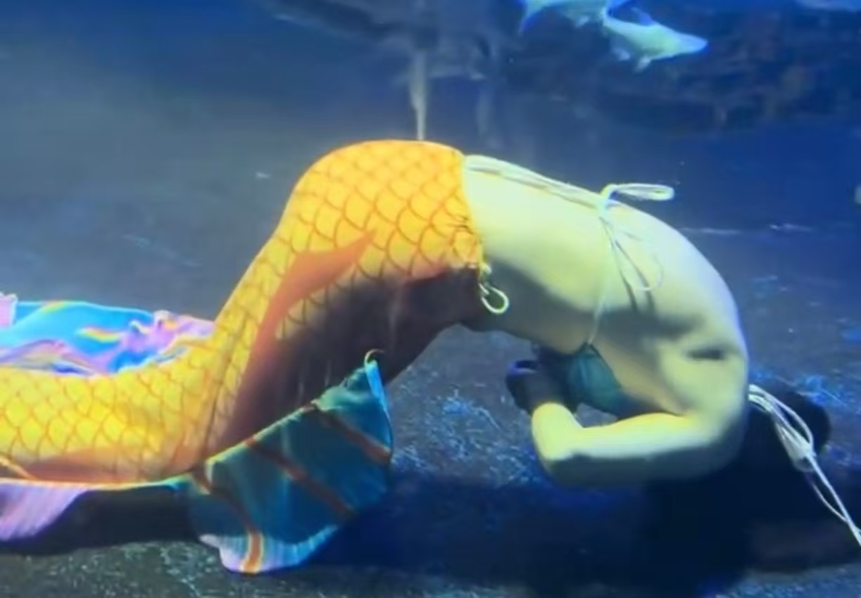 视频中,一位身穿金色鱼尾的美人鱼表演者脸朝下沉在水下,身体呈“虾米”状,不由自主地抽动着,她的脚踝掉在不远处。观众中有人低声讨论:“这是表演吗?”大约20秒后,一名救援人员排水,试图将其带离水面。