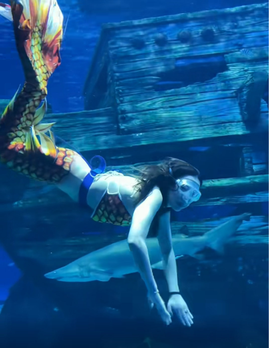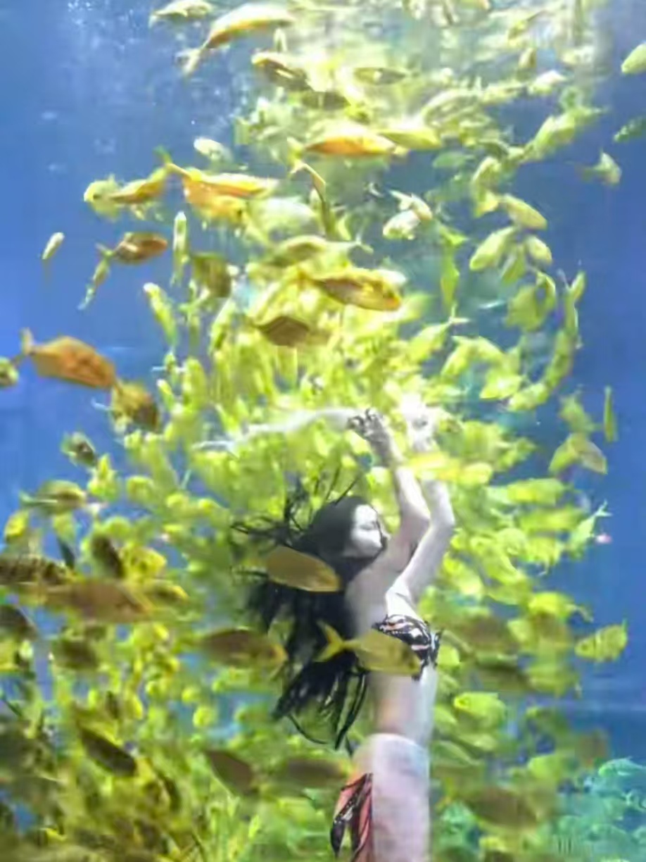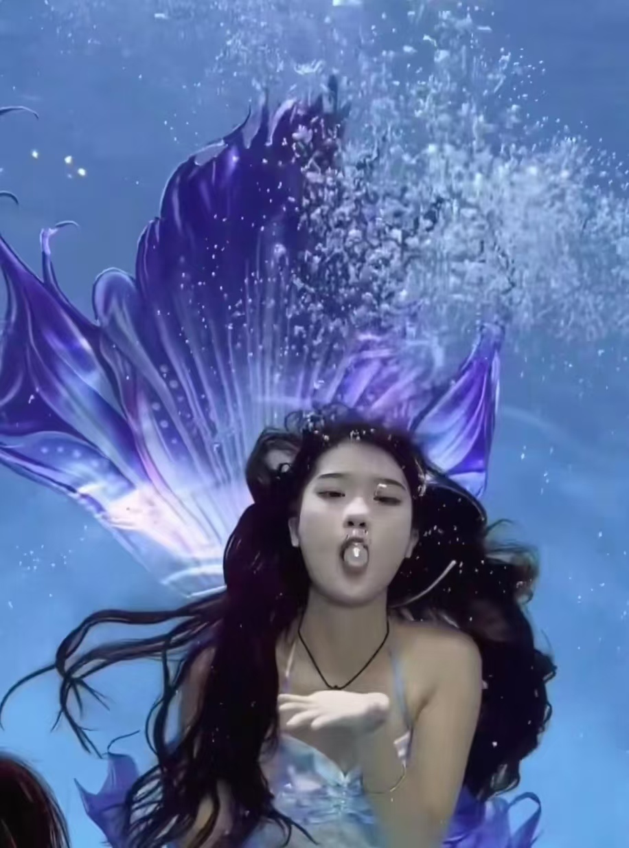 五颜六色的鱼尾在蓝色的波浪中摇摆,长发像藻类一样随着水流伸展。美人鱼化着精致的妆,微笑着吐出泡泡,轻轻挥动手臂,瞬间把泡泡变成心形,金鱼围着周围跳舞...每一帧都像是从安徒生的童话故事中走出来的场景,这就是小夏热爱这份工作的初衷。