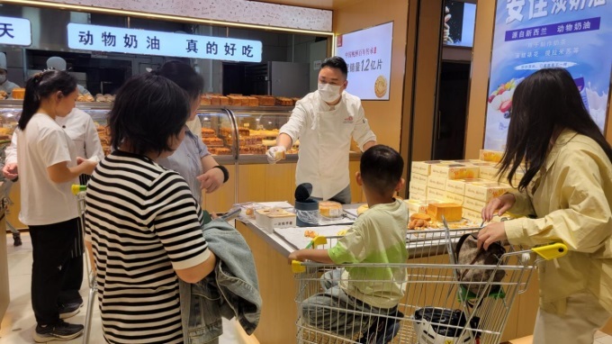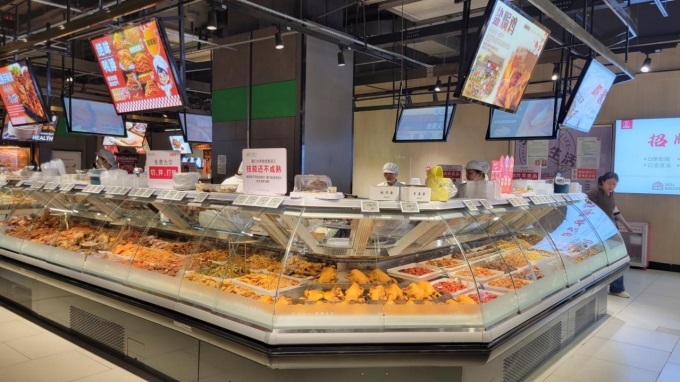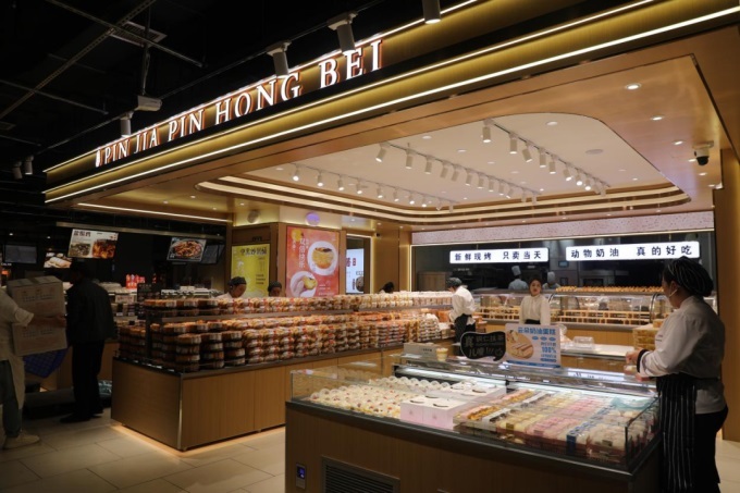 重点烘焙、熟食和现场加工区尤为引人注目。明亮厨房的设计让每一道美食的制作过程都透明可见。从西安凉面、中国汉堡、油面等地方特色小吃,到榴莲千层蛋糕、芝士蛋糕等精美甜点,再到海鲜、秘制红烧香肠、韩国炸鸡等美味佳肴,再到精心搭配的切菜和清淡的饭菜,丰富的品类选择不仅满足了消费者的多样化需求。更加利用现场生产的烟火气营造出温馨快乐的消费场景。店面特别注重将区域美食文化融入产品研发,让每一道美食都传达出品质生活的美好体验,同时保证食品安全和健康指标。
