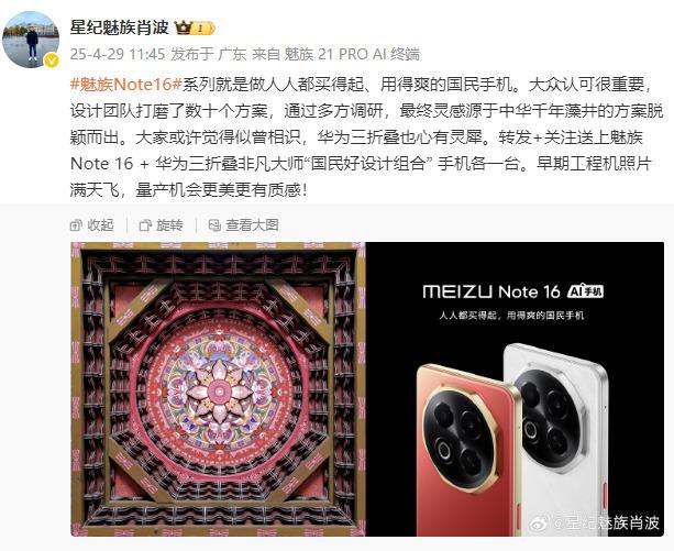 中国区星纪魅族集团总经理肖波公开了魅族集团 Note16 系列外观图,并表示“魅族” Note16 这个系列就是大家买得起,用得好的国民手机。魅族 Note16 最后,该系列受中华千年藻井方案的启发,与华为“心心相惜”。针对工程机器早期照片满天飞的现象,肖波表示,大规模生产的机会更漂亮,更有质感。