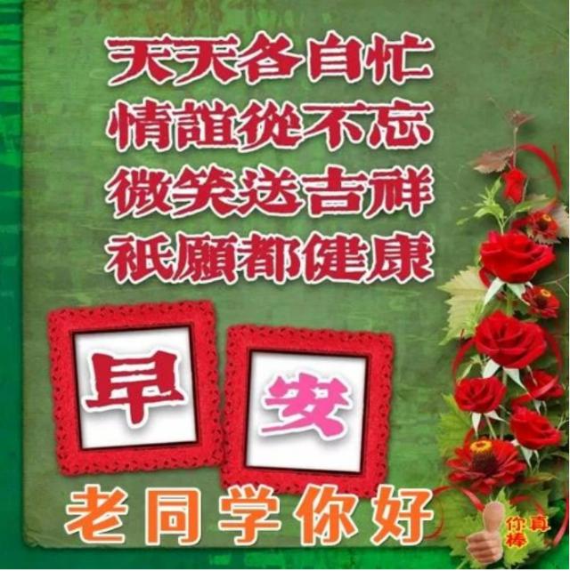 早上,我轻轻地推开窗户,让阳光洒在身上。我的心是温暖的,我对你充满了祝福。我悄悄地把它送到你身边。祝你一整天都有美好的时光。老同学,早上好!
