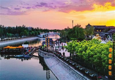 漫步古城,青石板路人流如织,全新亮化的“一河三街三巷”绚丽多彩。御河两岸更加热闹,音乐喷泉随着节奏舞动,花船巡游与两岸灯光秀相得益彰,再现了水旱码头的繁华景色。观景台上,游客们比肩接踵,沉浸在美丽的水岸联动画轴中。同样人头攒动的非遗市场,柳青剪纸,年画拓印等等。 12 一个非物质文化遗产代表项目在感受摊位之前,游客亲手制作,感受传统文化的现代活力。
