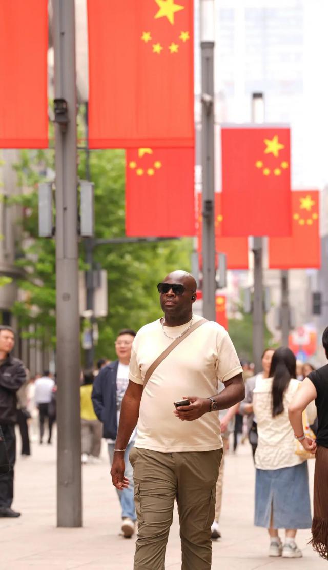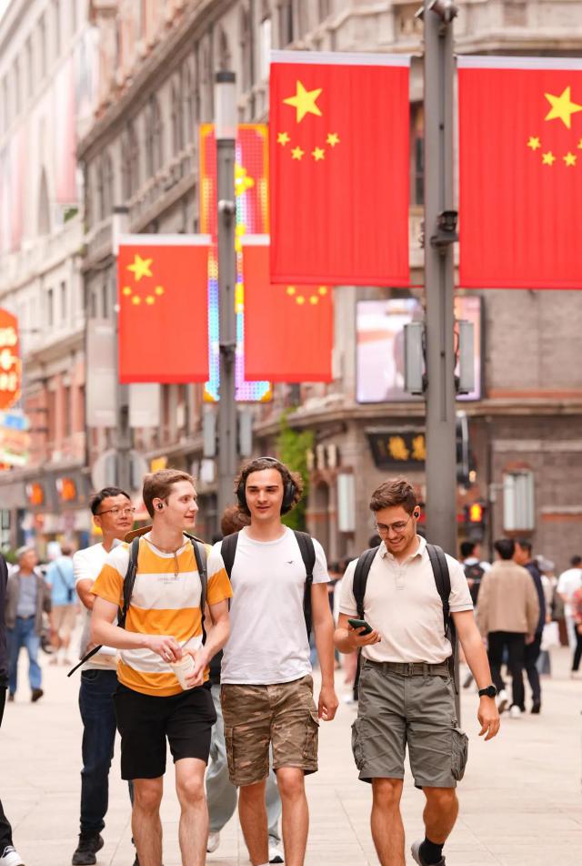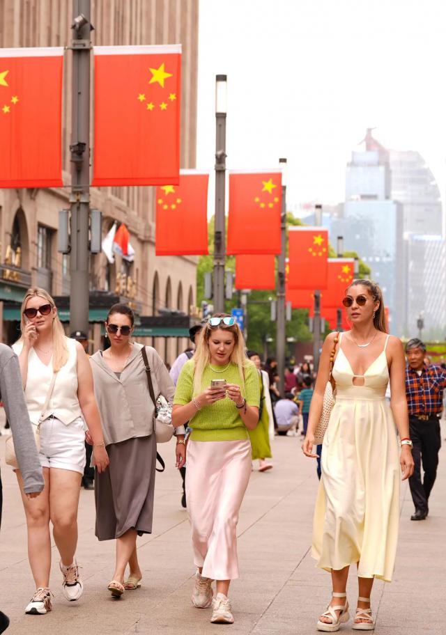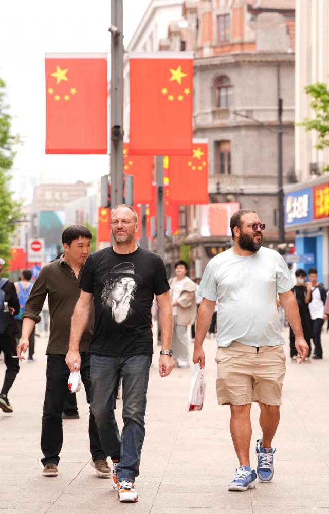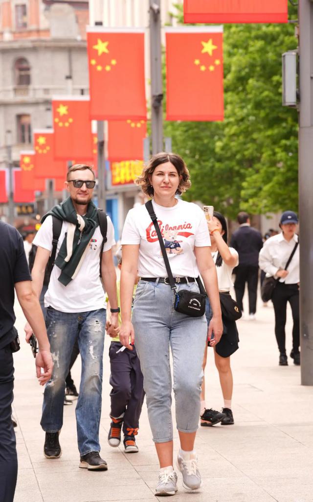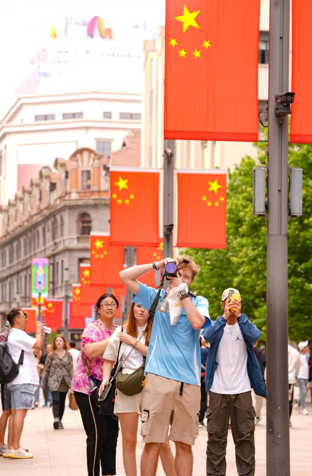 有游客笑着说:“看着街上来来往往的外国人,我恍惚中以为自己在海外,但当我抬头看到这些飘扬的五星红旗时,我真的觉得它们在上海。”