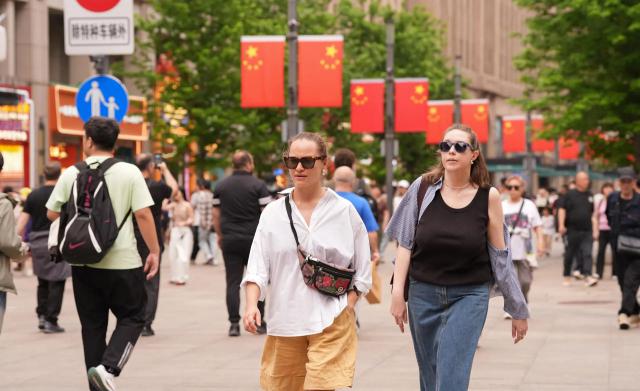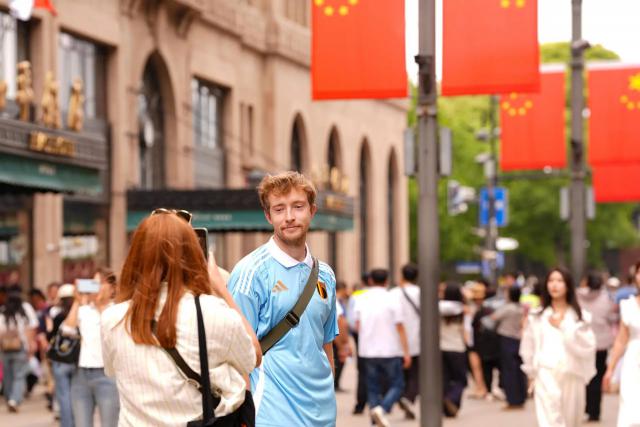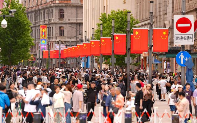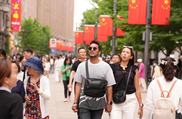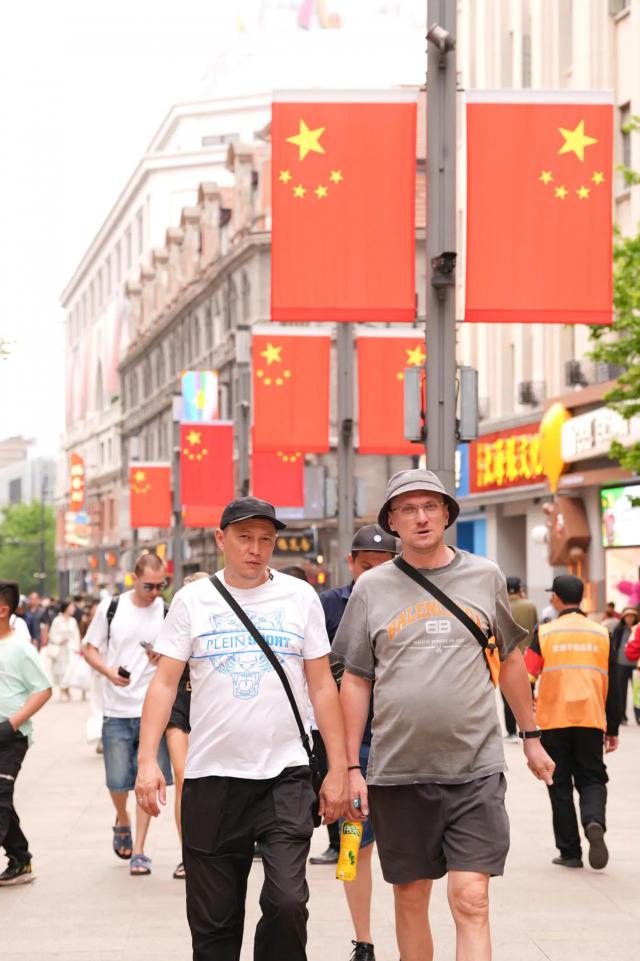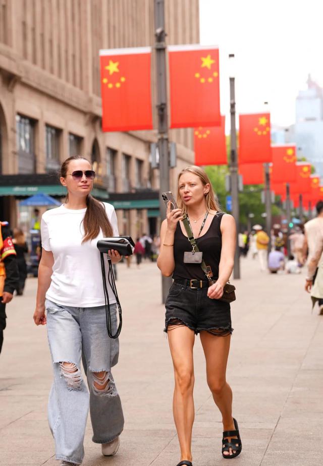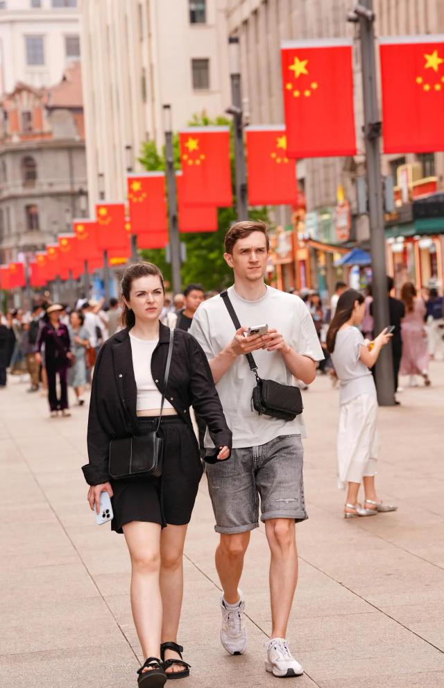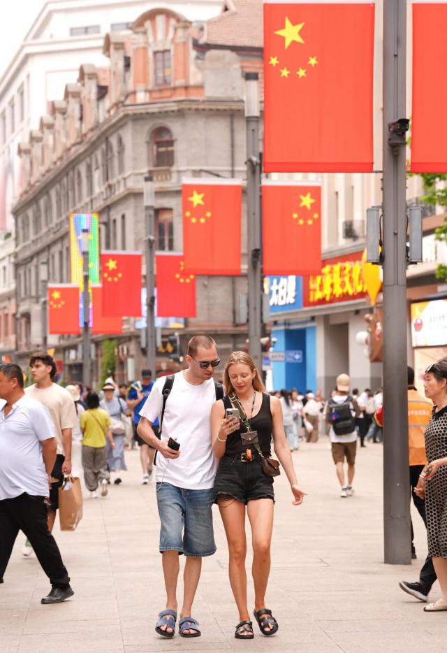 有游客笑着说:“看着街上来来往往的外国人,我恍惚中以为自己在海外,但当我抬头看到这些飘扬的五星红旗时,我真的觉得它们在上海。”