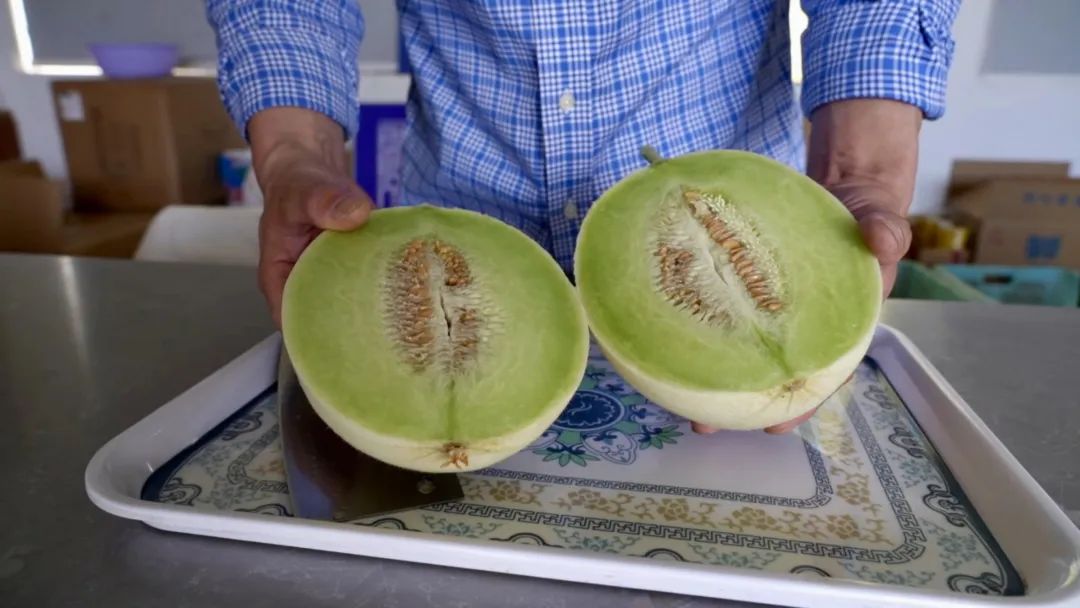 记者了解到,由于今年气温偏高,雨水较少,今年的头茬瓜比往年提前两周左右上市,无论是外观还是质量都相当出色。负责人顺手切了一个,瓜香浓郁,甜度达到16.9度。
