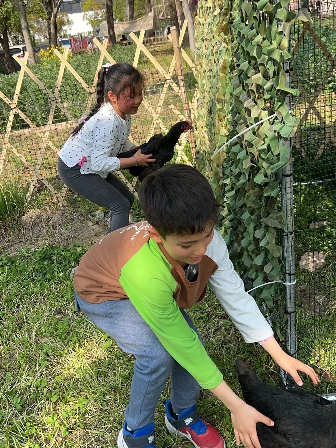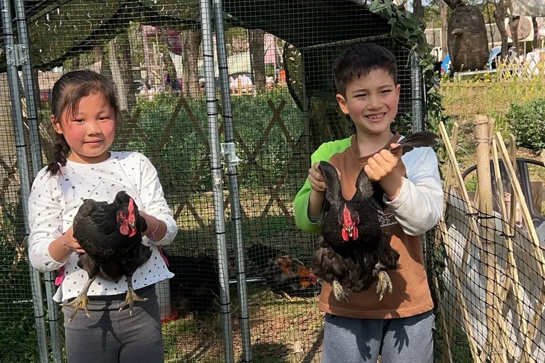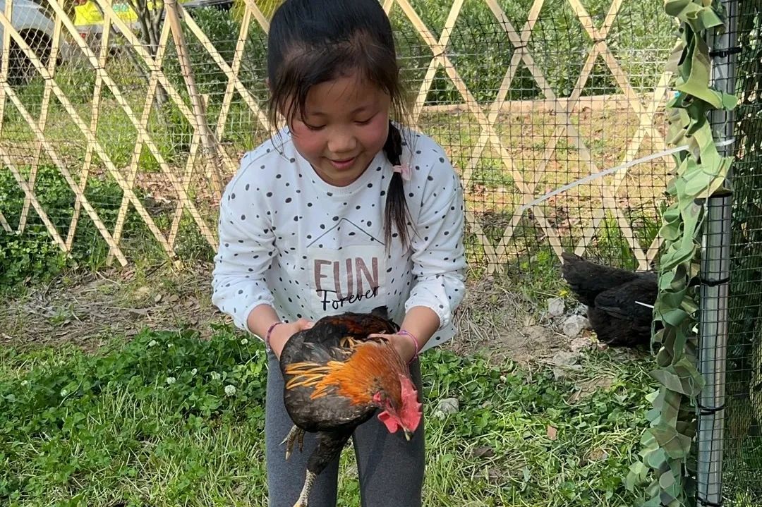 小孩和爸爸妈妈一起悄悄靠近悠闲漫步的鸡群,看着时机“突袭”抱鸡!追鸡,围攻,欢呼声此起彼伏。