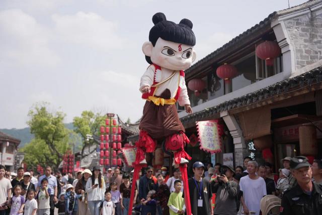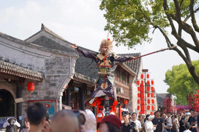 慈城古县景区作为传统热点,也充满了“热度”。在民权路街区,黑悟空巡游炸场和民族舞蹈吸引了许多游客驻足观看。