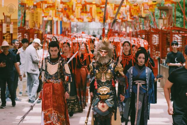 弥勒圣坛与《黑神话:悟空》破界联动,结合公园内须弥山实景空间,打造《须弥九章》第一章。 · “觉醒”艺术展,巨幅悟空布画,主题影神,语录墙,艺术衍生品等展现国游魅力,让游戏迷大呼过瘾。还有黑神话 · 悟空主题 Coser 惊喜亮相——齐天大圣踩着云挥棒,二郎神杨戬站着,四姐妹聪明,与国风仙子巡游队一起画了一个长长的神话卷,游客们争相合影,喊着“神仙打架”。