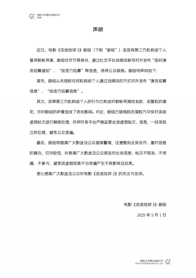 最近,电影《流浪地球》 3剧组发现,第三方机构或个人利用郭帆导演和剧组合作伙伴的身份,通过社交平台从媒体账号发布“临时演员招聘通知” “投资者招募”等信息,诱导公众联系。
