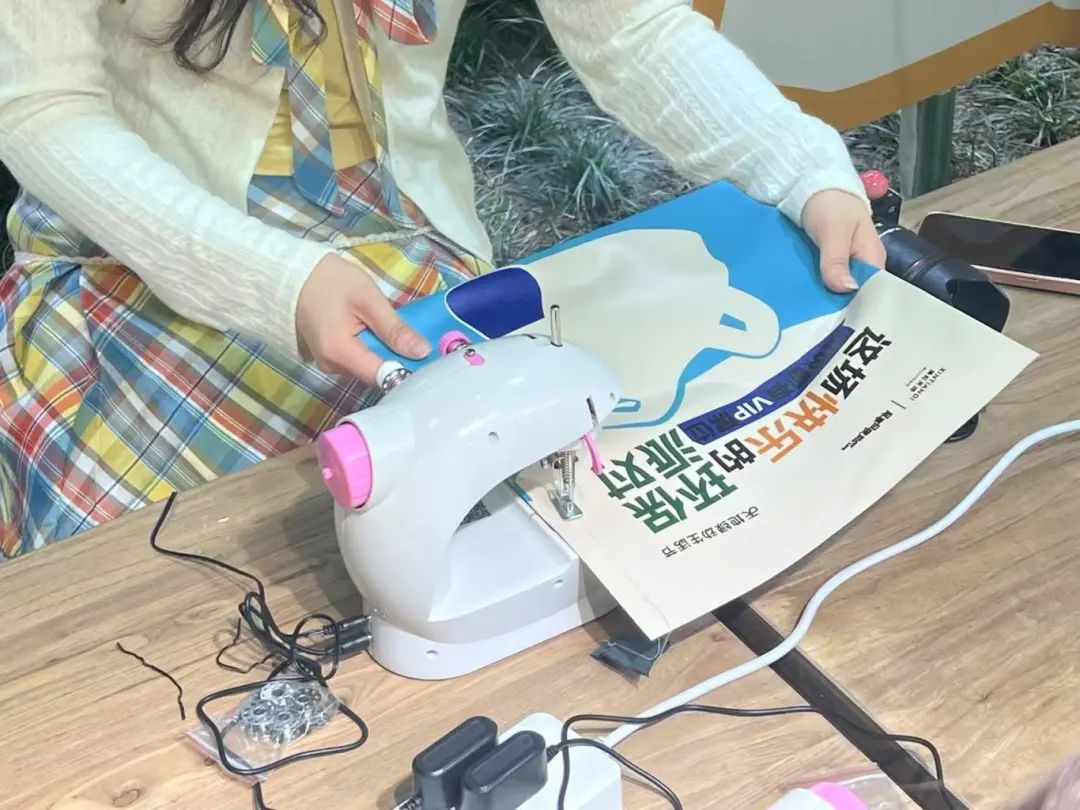 在“再生实验室”,用再生材料喷墨打印布制作环保袋的课程正在进行中。“先手动推几针,然后用脚踩按钮让电动缝纫机移动。小心手不要离针太近。”老师一边示范一边指导大家的操作技巧。