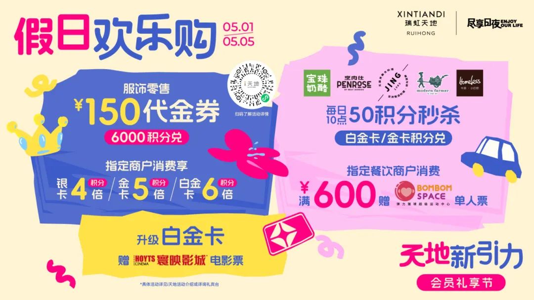 除了丰富多彩的活动,结合“五五购物节”,瑞虹天地还推出了“天地新引力会员礼享节”,会员可享受积分兑换优惠券、积分翻倍等专属折扣。商场还特别推出了夜间免费停车政策,21:00至次日2:00免费停车,消费388元后最高可享受8小时免费停车。