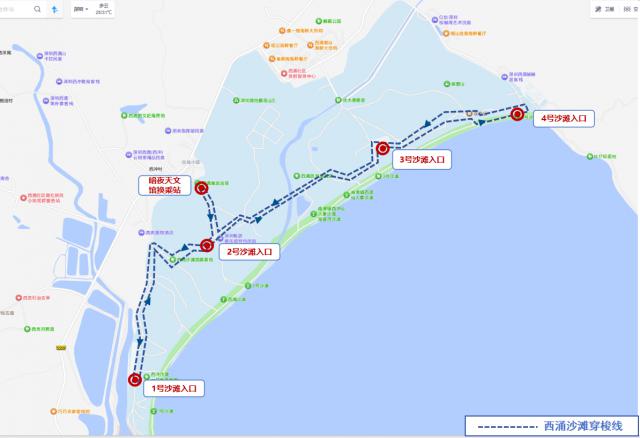 经过 1 号码海滩入口,2 海滩入口,3号 海滩入口,4号 号码海滩入口等网站,串联西涌景区4 个海滩