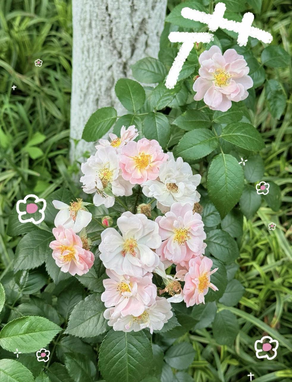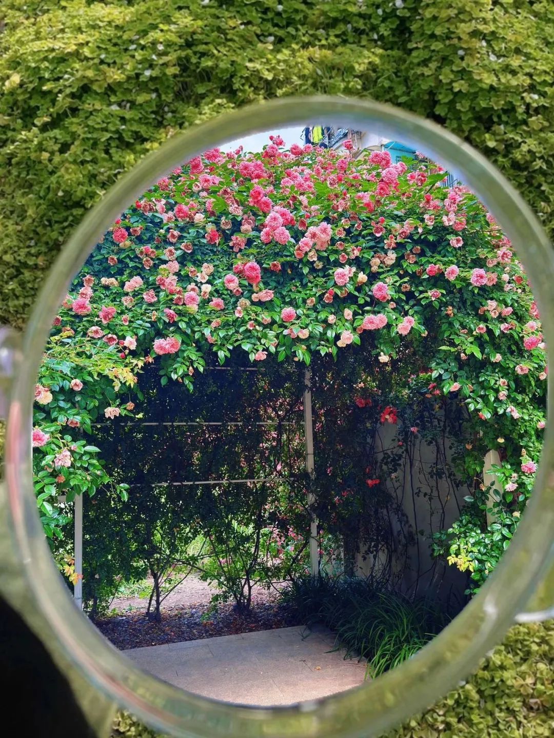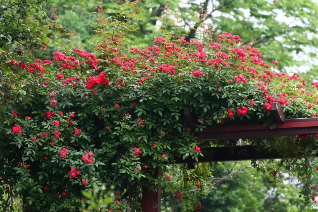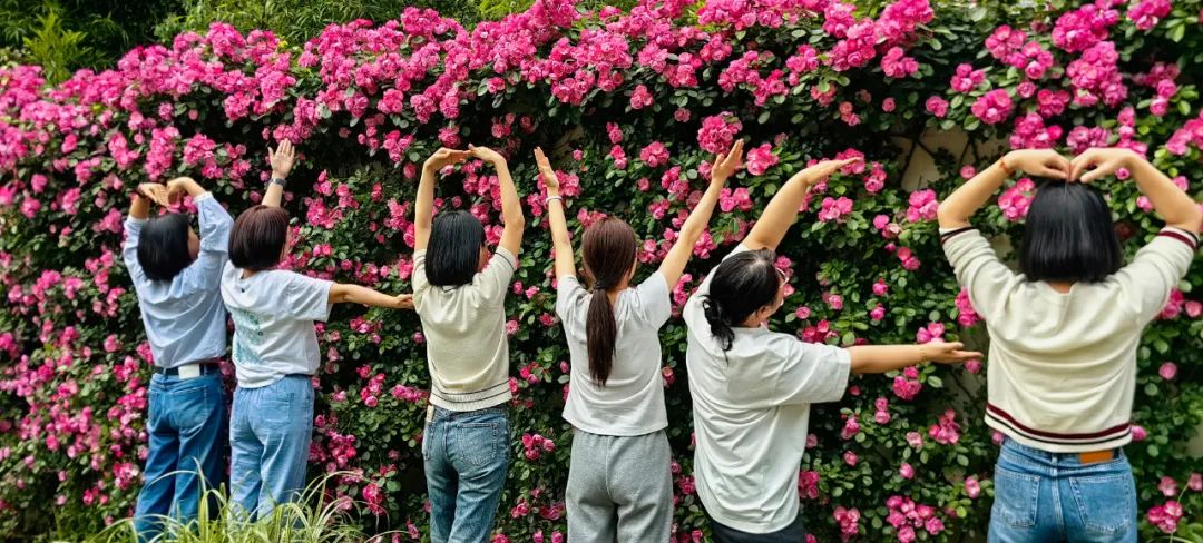 藤本玫瑰“安吉拉”花墙上覆盖着整面墙。