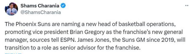 北京时间 5 月 2 日本,菲尼克斯太阳宣布了篮球运营部门的变动:副总裁布莱恩 - 詹姆斯晋升为球队新任总经理,格雷戈里 - 作为球队的高级顾问,琼斯转型。