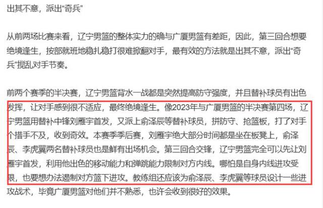 在 G3 在对抗之前,辽宁媒体沈阳日报发表了一篇名为《最后一站,辽篮必须重拾信心和决心》的文章,重点介绍了这篇文章 G3 辽宁要想避免在绝境中生存,就必须加强篮板保护。每个人都应该积极战斗,希望杨鸣能改变战斗中的士兵来扰乱对手的节奏。本文提到了辽浙对决。 G4 与去年辽粤对决 G4,辽宁总比分 2-1 刘雁宇、俞泽辰、李虎翼等奇兵在落后的情况下被激活,取得了意想不到的效果。最后,这些奇兵帮助辽宁完成了翻盘。