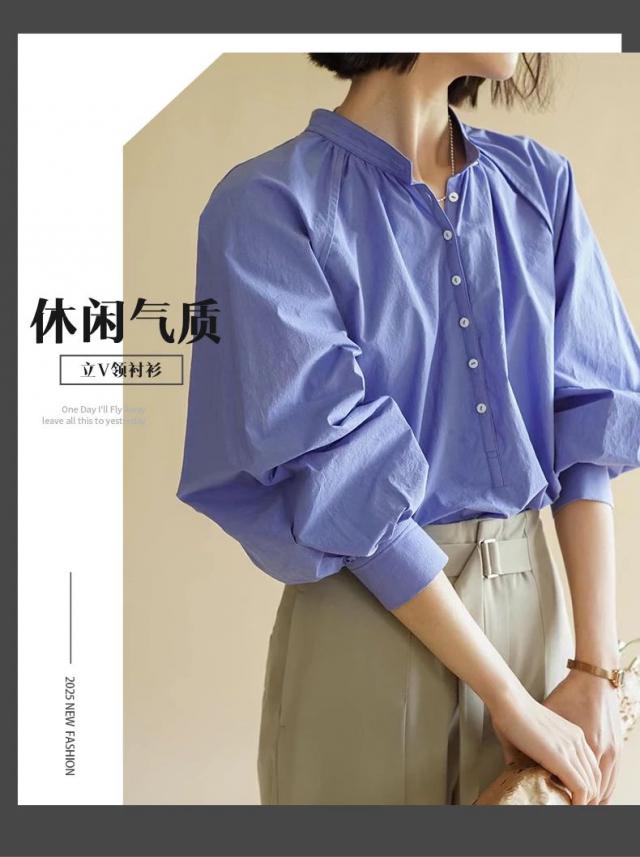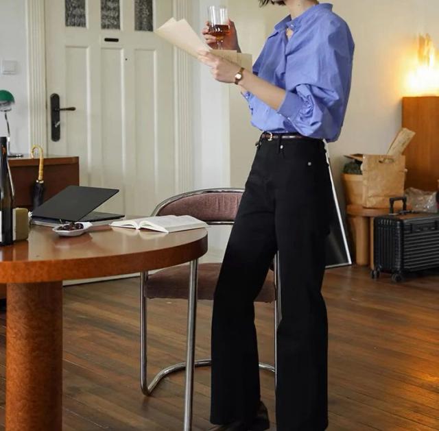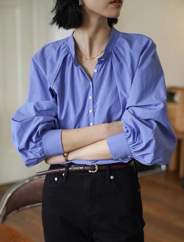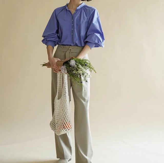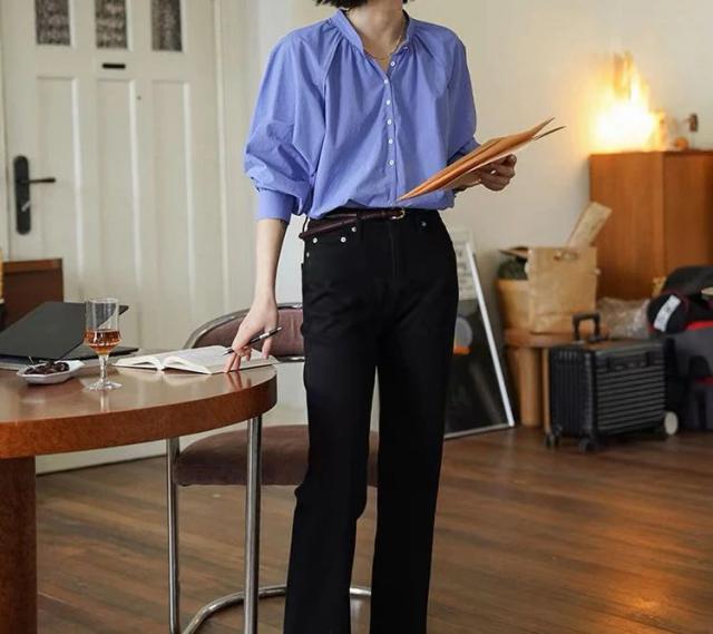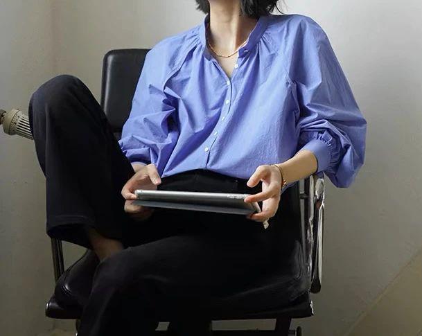 这种小立领灯笼袖蓝衬衣,是日常通勤的绝佳选择,搭配简洁的黑色直筒裤,干练时尚,瞬间提升职场气场;