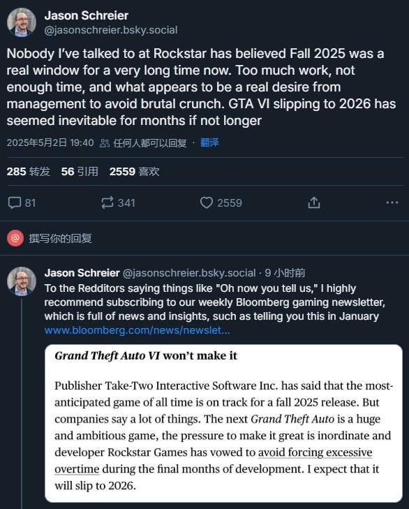 "我采访过的每一个人 Rockstar 员工不相信 2025 年度秋季发布切实可行”,Schreier “太多的工作要做,时间根本不够,管理层又忌讳了。 996,GTA 6 跳票到 2026 每年几成定局。”