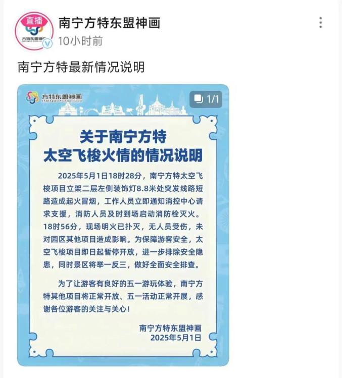 据《南宁方特东盟神画》报道,5月1日,由于装饰灯线路短路,广西南宁方特东盟神画景区“太空飞梭”项目发生火灾。当天18:56扑灭现场明火,未造成人员伤亡等设施影响。景区表示,消防预案将在事发后立即启动,该项目将从即日起停止维修,园区安全隐患将得到专项检查。五一期间,其他项目正常开放,游客可以继续感受其他活动。