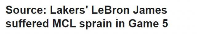 北京时间 5 月 3 日,据 ESPN 据报道,詹姆斯是第一轮 G5 与迪文琴佐碰撞后接受核磁共振检查,检查结果显示,詹姆斯受左膝内侧副韧带影响(MCL)二次扭伤。据消息人士透露,这种伤害意见的恢复时间是 3 到 5 周。