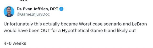 医学专家 Jeffries 还转发了詹姆斯受伤的一幕,并表示,即使有, G6 可以打,詹姆斯也很有可能处于缺战状态,他认为这需要。 4-6 周可以完全康复。现在,詹姆斯的休赛期已经开始了,祝福老詹好好照顾自己,早日康复。