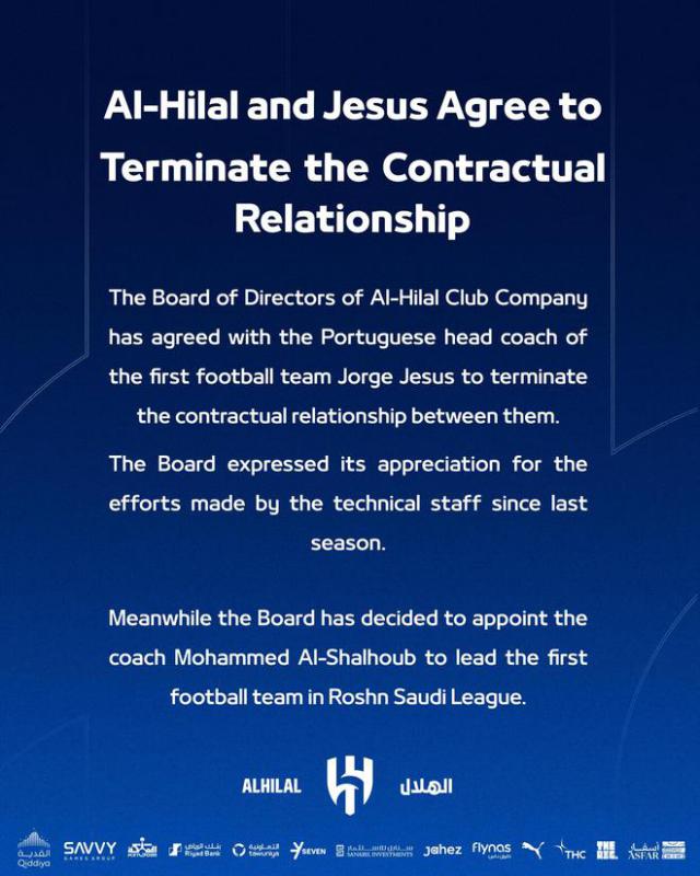 直播吧 05 月 03 日讯 官方公告利雅得新月,球队主教练若热 - 在之前结束的亚冠精英联赛半决赛中,热苏斯下课,利雅得新月。 1-3 没有输给吉达国民,没有决赛。