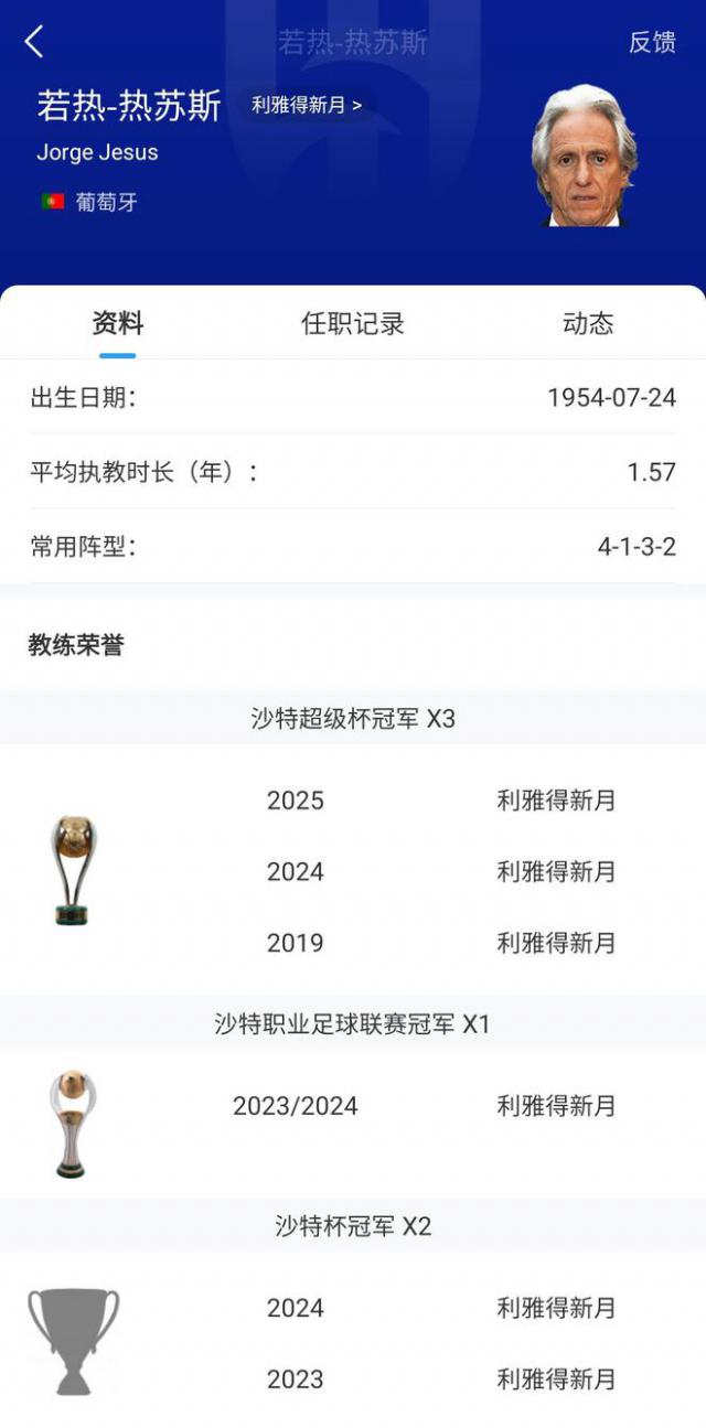 70 老年葡萄牙老帅若热 - 曾经执教过本菲卡、葡萄牙体育、弗拉门戈、费内巴切等多支球队的热苏斯,2023年 年 7 月球第二次担任利雅得新月主教练,共领队。 99 场,获得 80 胜 10 平 9 负面记录,帮助球队赢得胜利 1 第二次沙特联冠军,2 第二届沙特杯冠军和 2 第二次沙超杯冠军,但是利雅得新月两次停止了亚冠(亚冠精英联赛)半决赛,错过了冠军。