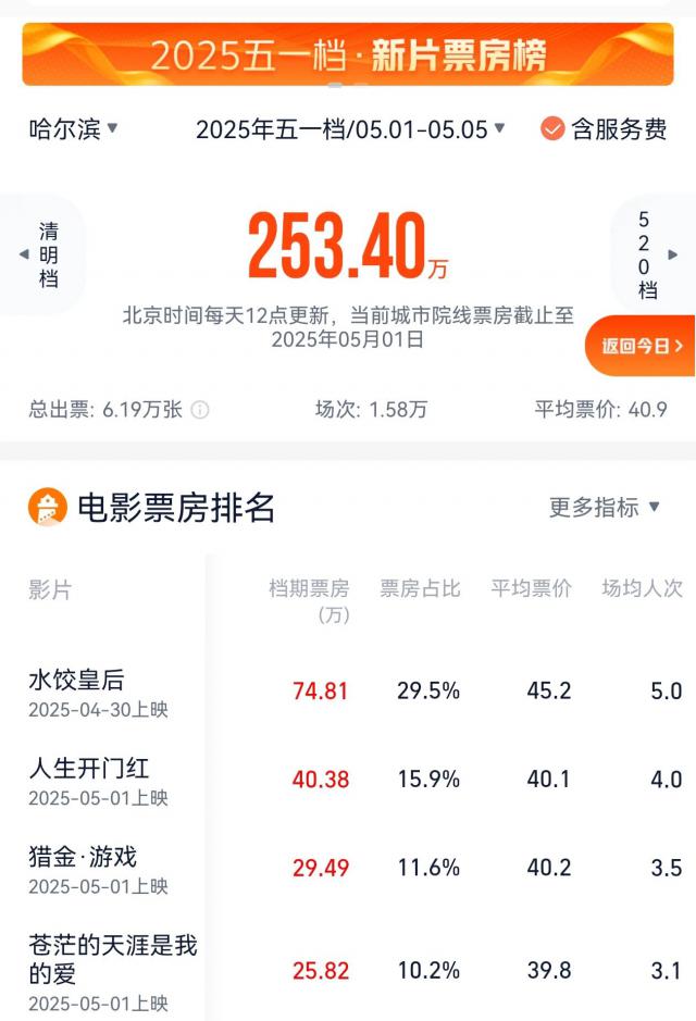 5 月 2 今天下午,哈尔滨“五一”档电影票房突破 253 一万元。演员马丽的作品一直很受东北同乡的欢迎。这一次,她主演的励志电影《饺子女王》一路领先,一直占据着单日票房冠军的宝座。截至发稿时,全国“五一”新电影票房榜已突破 3.43 亿元。