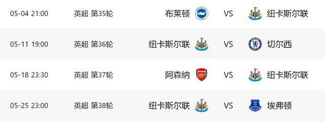 除曼城外,纽卡斯尔也是争五的热点。最后 4 在这场比赛中,纽卡斯尔的对手是布莱顿、切尔西、阿森纳和埃弗顿。这个赛程真的很难,但是他们和切尔西的比赛是在主场比赛。只要他们击败对手,纽卡斯尔很可能会彻底摆脱英超豪门,纽卡斯尔目前领先维拉。 5 分数,到时候他们将很有可能锁定一个珍贵的前五位。