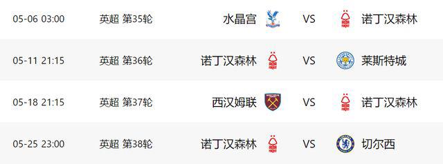 尽管诺丁汉森林已被挤出前五名,但它们仍然有一个很大的优势,那就是赛程轻松。最后 4 在一场比赛中,诺丁汉森林与水晶宫、莱切斯特城、西汉姆和切尔西进行了对战。尤其是在主场和切尔西的比赛中,如果诺丁汉森林能够 3 分数,他们也有把握锁定前五。