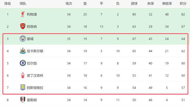 本次 1-0 此后,英超争五新的局面诞生了。到目前为止,从第三个曼城,到第七个维拉, 5 团队之间的差距已经扩大到了 7 分。曼城在多赛 1 在场地的情况下,领先第一 6 诺丁汉森林 4 分数,换句话说,不管其他对手的比赛结果如何,曼城前五的位置都是稳如泰山。在五大战争中,瓜帅的球队已经领先,只要最后结束, 3 对阵南安普顿、伯恩茅斯和富勒姆的比赛 9 得分,曼城肯定会晋级下赛季的冠军杯。