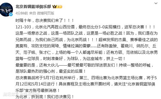 比赛结束后,北京男篮官方社交媒体发布:十年后,总决赛我们来了!!