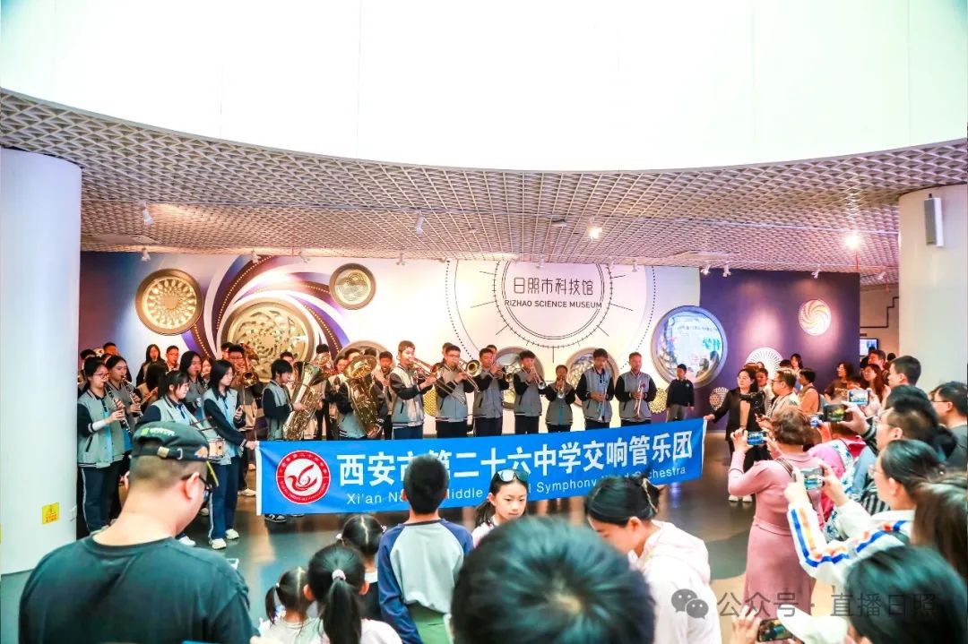 这部电影还没唱完,那边马上就出现了。镜头变成了日照科技馆,演奏者们已经摆好了阵容,一首经典歌曲传来,时而柔和缓解,时而充满激情,与充满科技感的氛围奇特结合,吸引了大量市民和游客用手机记录这一“超燃”场景;在日照海洋公园,管乐的音符与波浪交织在一起,每一个路过的游客都停下来,仿佛瞬间进入了梦幻音乐的海洋。