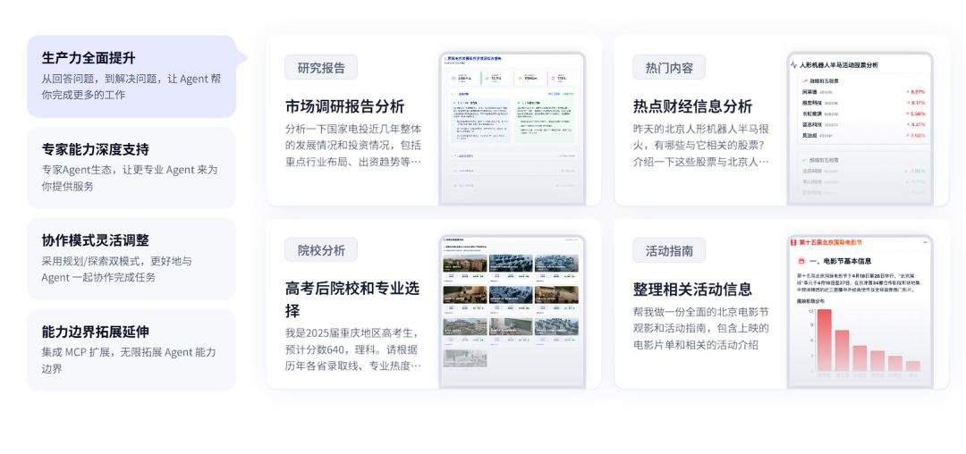首先,字节在4月18日发布了通用Agent产品的“纽扣空间”,并推出了免费测试,以每人5个推荐码的裂变方式,率先占领市场;4月22日,阿里的AI助手“心流”推出了先进的研究功能,主要推出了类似OpenAI的智能体DeepResearch报告研究;然后,在4月25日的开发者大会上,百度正式宣布了智能体的“心声”,专注于医疗、法律、绘本等多种适应生活场景的任务感受。