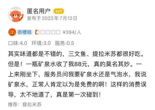 “茉莉”说,她的经历不是个案。通过查询一个评论网站,很多消费者都提到了这家餐厅的以上提供方式。 88 元矿泉水的状况。