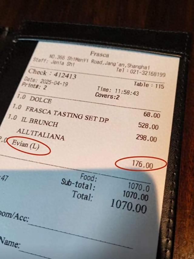 餐馆里的“茉莉”账单显示两瓶依云水收费。 176 元