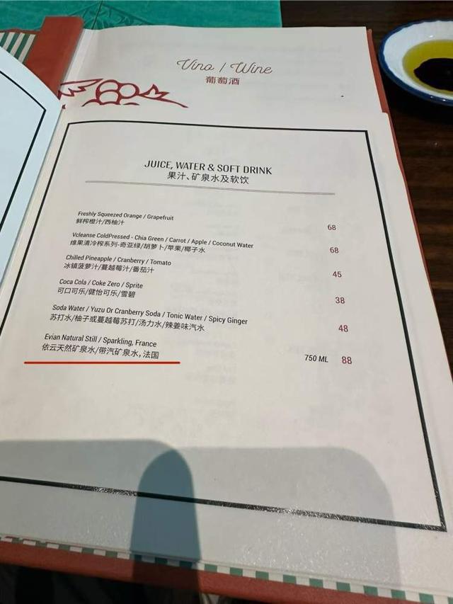 餐馆提供的饮料清单显示,“依云天然矿泉水”的价格 88 元