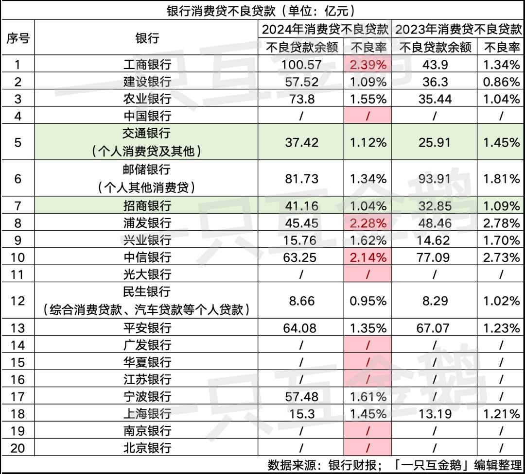 交通银行、招商银行消费贷款不良规模增长,但消费贷款不良率下降。