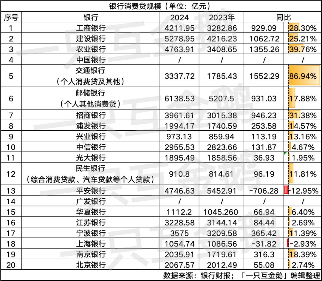本文,「一只互金鹅」对比较有代表性的银行2024年年报数据进行了梳理,发现大多数银行在2024年的消费贷款余额都有了很大的增长。