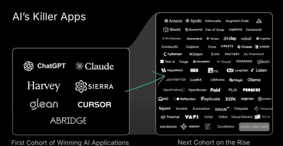 索尼娅认为,过去几年的发展表明,价值正在逐渐流向网络层面。她特别提到Harvey和Open。 像Evidence这样的公司创造了以客户为导向的价值,ChatGPT等首批人工智能杀手级应用、Harvey、Glean等已经崭露头角。