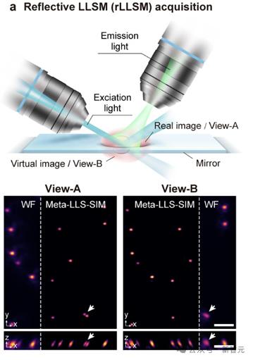 为了解决这个问题,研究小组用反射镜代替了承载生物样本的盖玻片。三维成像时,镜面上方的实像和下方的虚像同时拍摄,两者的空间视角不同。
