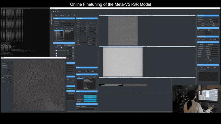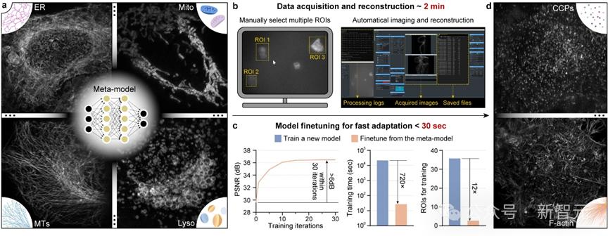 为了简化操作步骤,研究小组仍然在显微镜管理程序中实现了通用元模型部署过程的全自动化。用户只需点击图形界面中的几个待收集区域,然后整个过程就可以在后端自动实现,从数据收集到训练集的超分辨率重建,再到元模型的微调,不到3分钟。