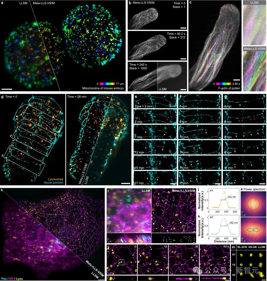 合作团队从单细胞到胚胎尺度的各种生物样本进行了测试,包括植物花粉管、小鼠胚胎、美丽隐杆线虫胚胎和真核分裂或分裂期间的其他真核生物,并得到了验证。 Meta-LLS-VSIM 能够快速、长时间、混色三维超分辨率成像任务。